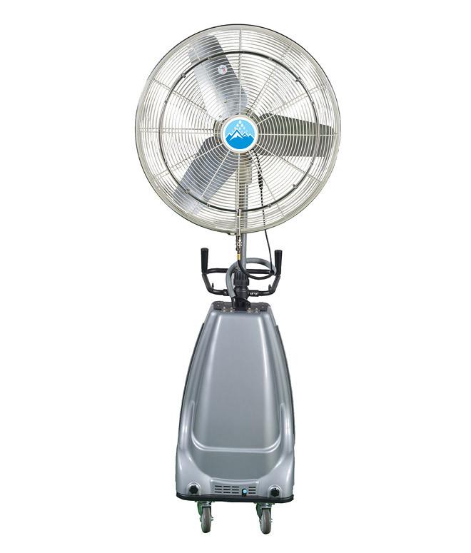 Ventilador portátil con sistema de nebulización (brisa o misting) de alta presión marca Ventomist, Modelo VTHPMF-3010, 30 pulgadas de diámetro y 3 velocidades, color gris con blanco. Nota: Este modelo también se le conoce como enfriador de aire, ventilador nebulizador, ventilador con brisa, misting system o abanico industrial.
